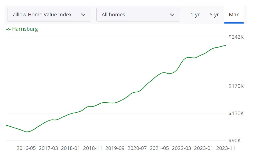 According to Zillow, the average Harrisburg home value is $230,038, up 7.1% over the past year and goes to pending in around 8 days. (Data through November 30, 2023)